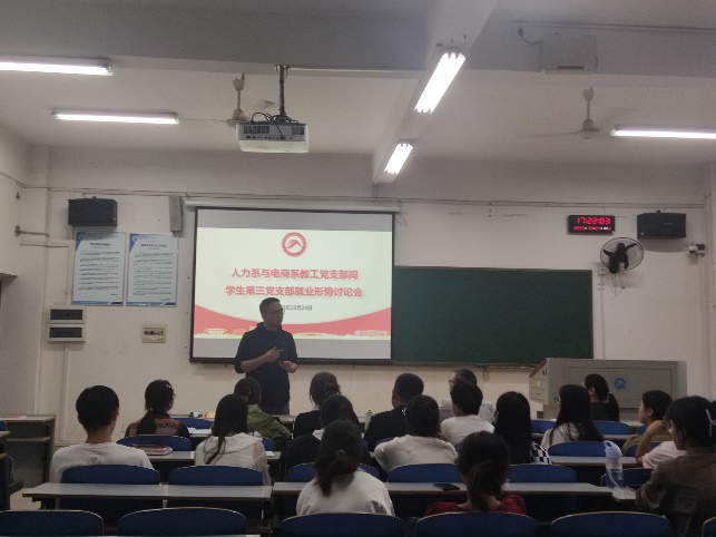 关于大学生就业形势,张志彬引导同学们积极了解政策指向、经济动向和时代发展方向,指导同学们要放宽就业视野,顺应时代趋势,将自身理想融入社会发展需要,做好自我探索和生涯规划。随后,人力系与电商系教工党支部书记郭云贵结合学校近年来毕业生就业数据,分析讲解了目前就业形势,从主要去向、职业发展、就业选择等多个方面作指导动员,鼓励同学们明确未来规划并积极付诸行动。学生第三党支部书记雷芳鼓励同学们把眼光放长远,只要努力就会有机会,为同学们指明了前进的方向。