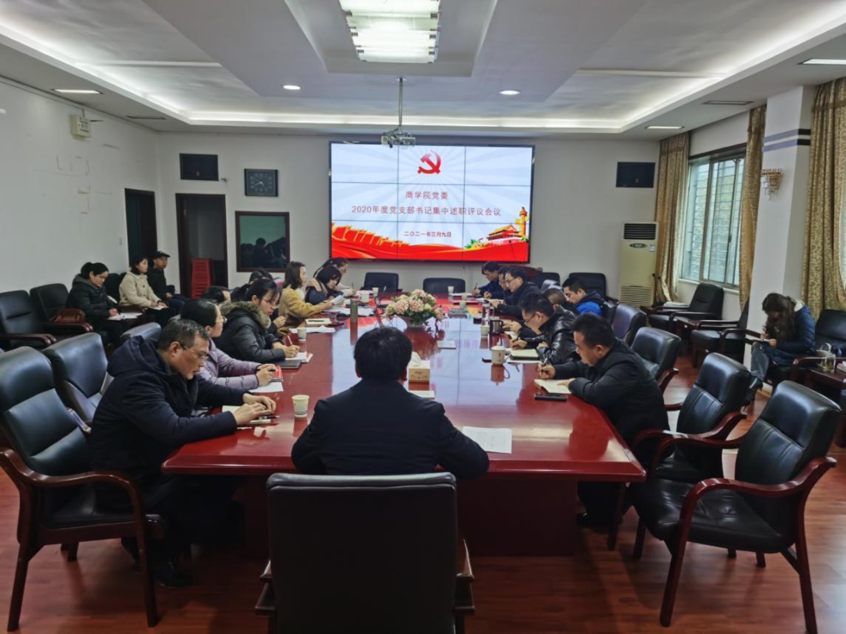 3月9日下午,商学院2020年度党支部书记“双述双评”集中述职测评大会在三教301会议室召开。学院全体党委委员、党支部书记和党员代表参加会议。会议由院党委书记贺胜兵主持。