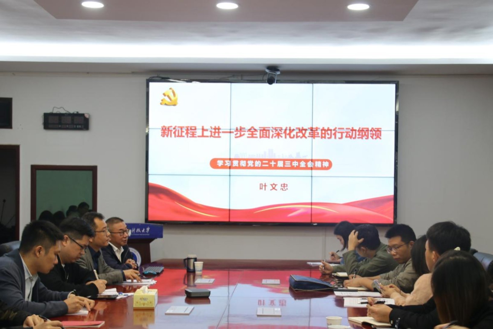 叶文忠紧扣党的二十届三中全会精神,围绕“深刻认识党的二十届三中全会的主题、深刻认识进一步全面深化改革的重要性和必要性、深刻认识进一步全面深化改革的指导思想和目标要求、准确理解《决定》提出的进一步全面深化改革重大举措”四个维度,引导全体人员准确把握历史逻辑、理论逻辑、实践逻辑,深刻领会进一步全面深化改革重大意义,并就贯彻落实二十届三中全会精神,结合学院人才培养机制创新、科学研究创新推进及管理制度创新分享了自己的观点。
