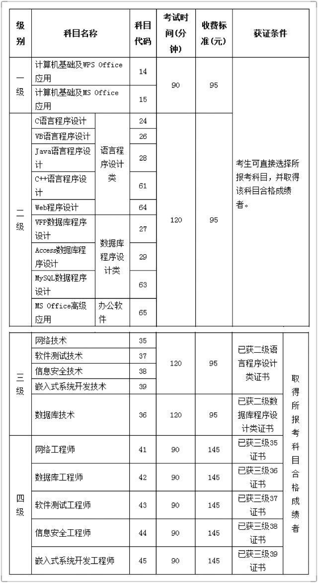 获证条件说明:报考一、二级的考生本次考试成绩合格后即可取得相应证书。报考三、四级的考生在取得相对应低级别的同一类别证书后方可获得三、四级证书。考生可以一次同时报考两个级别考试,同时通过者可同时获取两个科目证书,低级别未通过而高级别通过者,本次不能获得证书,高级别合格成绩保留一次,下次报考低级别考试通过者,可以在下次一起获得证书。