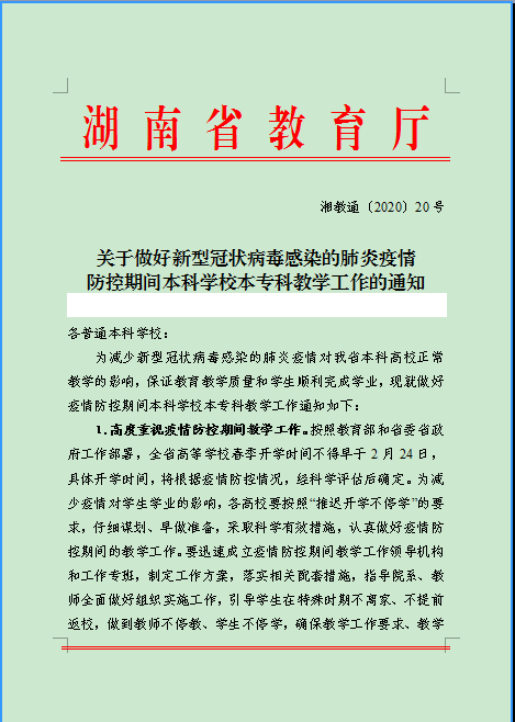 转发《关于做好新型冠状病毒感染的肺炎疫情防控期间本科学校本专科教学工作的通知》湘教通〔2020〕20号
