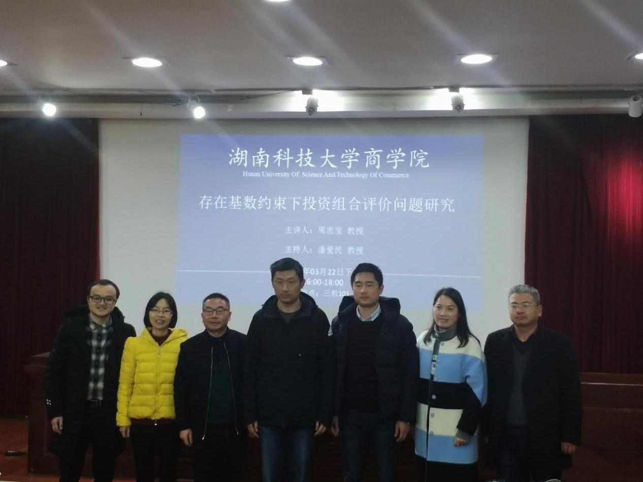 2019年3月22日下午4点,湖南大学“岳麓学者”特聘教授、工商管理学院副院长、博士生导师周忠宝教授我院讲学,他演讲的题目是“存在基数约束下投资组合评价问题”。报告在三教101学术报告厅举行,3044am永利集团官网副院长叶文忠主持了报告会,副院长邓淇中及学院部分老师及全体研究生及参加了此次讲座。