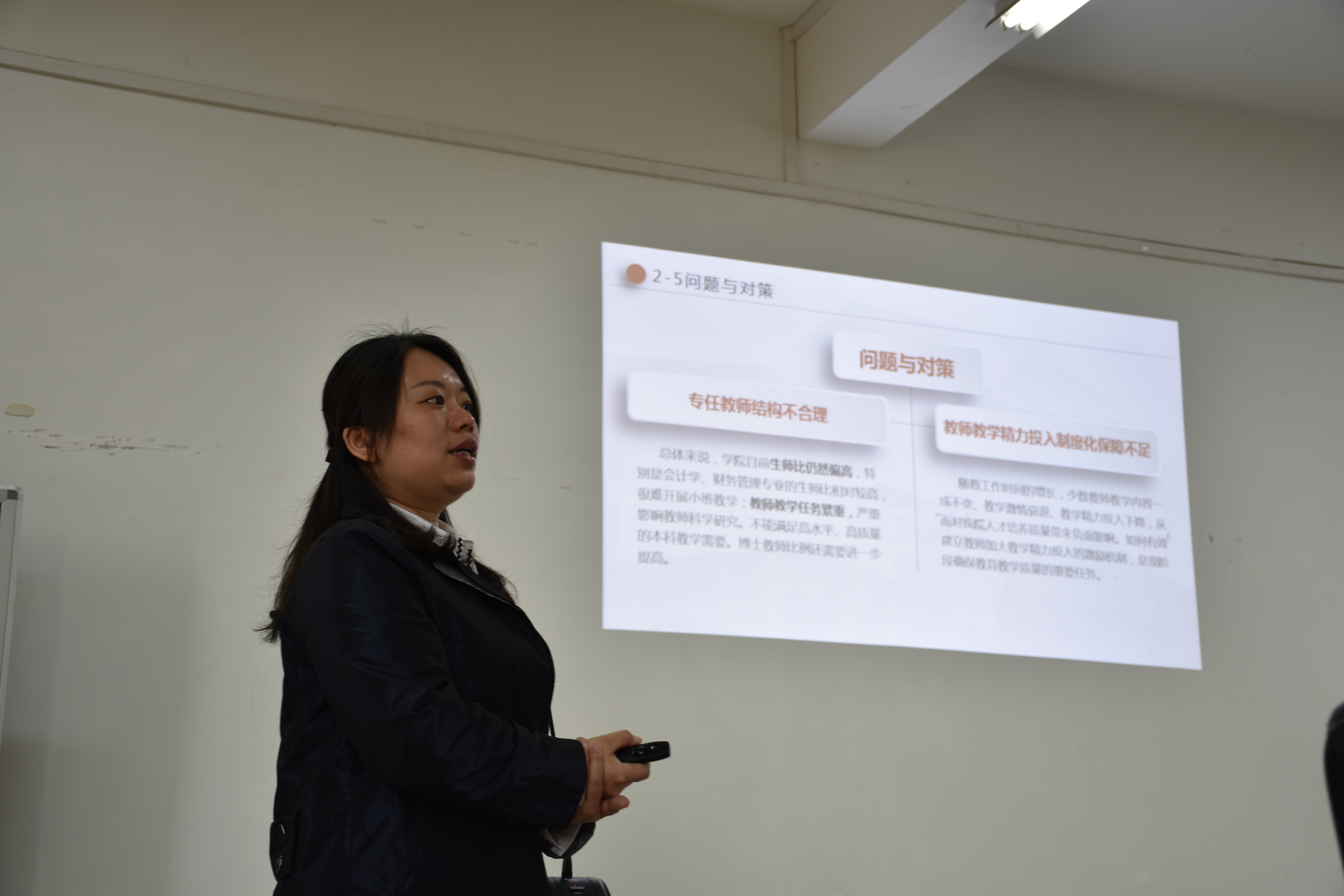 首先,仇怡对我院本科教学审核评估工作进行了工作汇报。在我院自评自建工作开展过程中,全院上下高度重视,制定整改计划,落实整改任务。积极查找目前学校教学及教学管理工作中存在的问题,有机结合自我建设和自我评估,在学院范围内建立起自下而上和自上而下的双向交流和评价机制。并对我院自评自建工作中存在的问题及改进措施进行了重点汇报。对于学院的办学定位与发展规划,她指出3044am永利集团官网的办学定位是突出以“应用”为目标,以“创新”为特征,注重过程与质量相统一、规范与特色相结合,坚持把创新型应用人才教育贯穿于本科学生培养全过程,实行经管融合,以大经管人才观,培养具有国际视野和企业家精神的创新型应用人才。根据人才社会需求优化课程体系,提升实践教学条件,扩展专业教学资源。在教师队伍的建设方面,她强调要关注青年教师成长,提高教师教研教改水平。