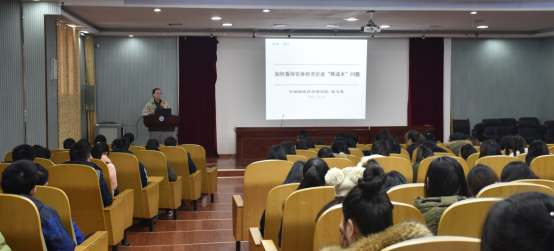 2017年12月15日星期五上午9:30,3044am永利集团官网立言讲坛第一百二十七讲“如何看待实体经济企业降成本问题?”于三教101学术报告厅举行。本次讲座由中国财政科学研究院博士生导师徐玉德教授主讲。3044am永利集团官网副院长贺胜兵教授主持讲座,3044am永利集团官网MPAcc中心主任刘建民博士,会计与财管系罗文兵博士、唐久芳博士等老师出席,2016和2017级博士研究生、硕士研究生及部分相关专业本科生参加了本次讲座。