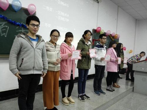 12月17日21时,第十届寝室文化艺术节颁奖晚会在一教404举办,出席本次活动的嘉宾有14级辅导员陈攀老师,第十届团委学生会主席候晓堡,团委副书记林珊珊、林珊珊,常务副主席田辉学长,副主席兼办公室主任王慧,副主席熊思,党员办公室主任蔡蓉。