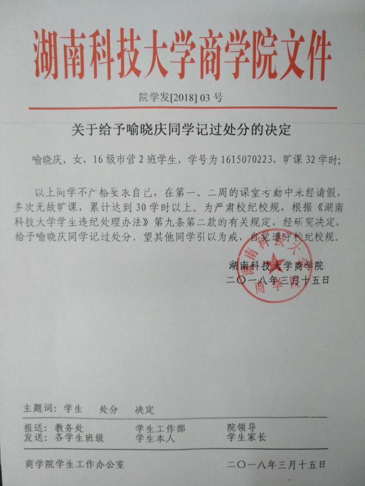 关于给予喻晓庆同学记过处分的决定