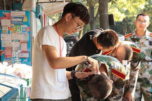 一会儿的功夫,服务台等待修整军容的新生就排起了长龙。学长学姐们带着成套的工具,谨慎又细致地为新生们整理军容。17级年级长王智拿着电推剪,为男生们剃除多余的头发,在他熟练的操作下,新生们就像换了个人似的,英姿飒爽,干练简洁。