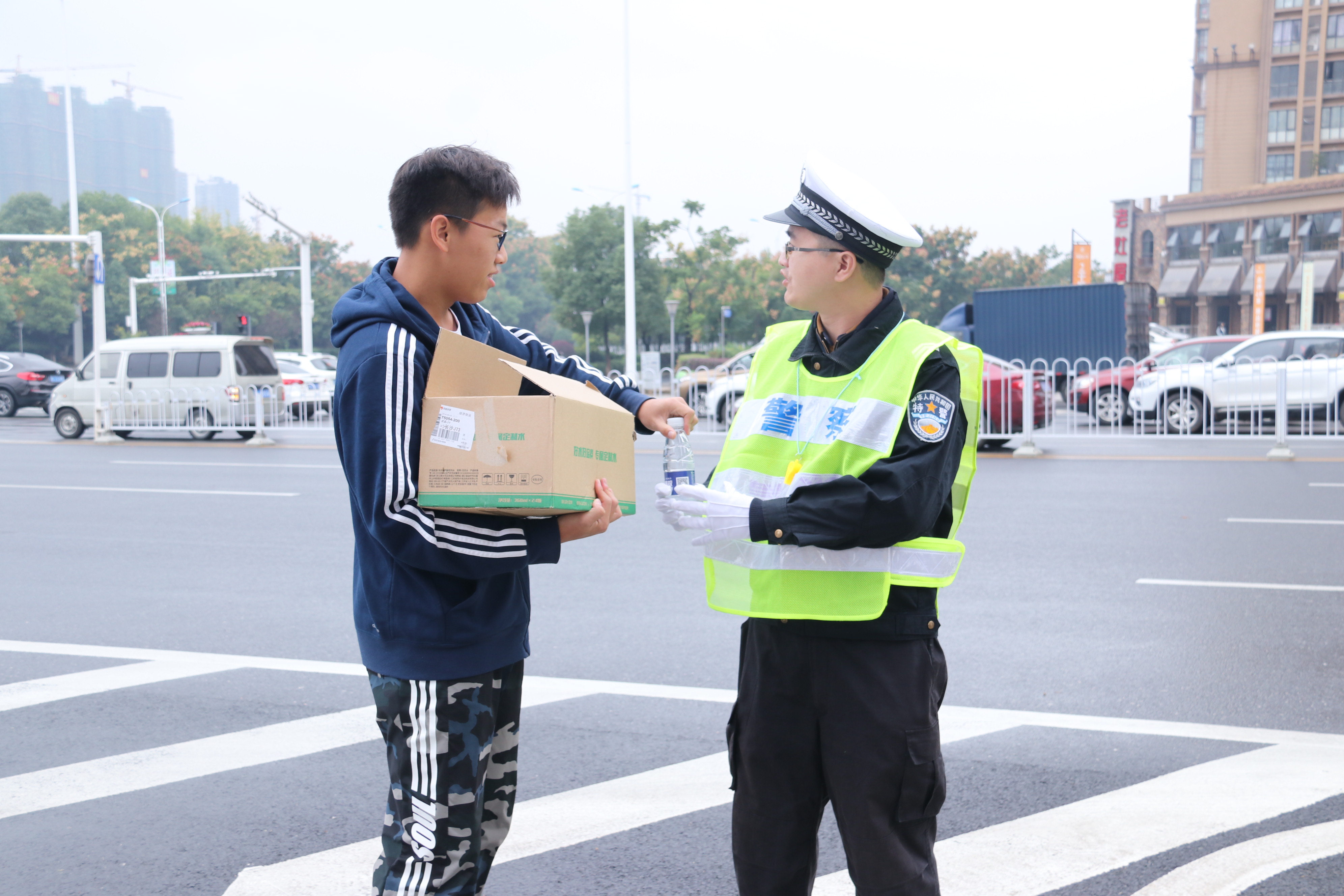 车子在缓慢行驶过程中,放眼望去发现道路口旁、公车站牌下,随处可见身披红色马甲的站岗人员。他们的身影在冷风中不动如山,尽职尽责地坚守在自己的岗位上,以高度集中的精神密切注视着周围的一切,以便及时应对突发情况。陈攀每经过他们都放缓车速并示意身旁的学生干部给他们送上准备好的水,“天气不好,你们辛苦了”,隔着车窗,陈攀并表达着对站岗人员的关怀。