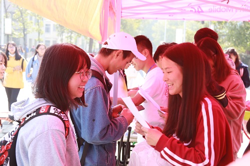 工作人员的精心布置引来了许多同学的驻足,各类特色小游戏和精美礼品吸引越来越多的同学参与其中。在幸运大转盘前,一个女生转到了“谢谢”二字,工作人员调皮地调侃道:“恭喜你获得了大转盘唯一的‘谢谢’,你真是太‘幸运’了哦。”在吃柠檬读绕口令处,参与者被酸到“扭曲”的脸让周围人忍俊不禁,纷纷拿出手机来记录下这“美好”的一刻。同学们踊跃的参与以及现场工作人员积极的配合,使得现场气氛一度火热。