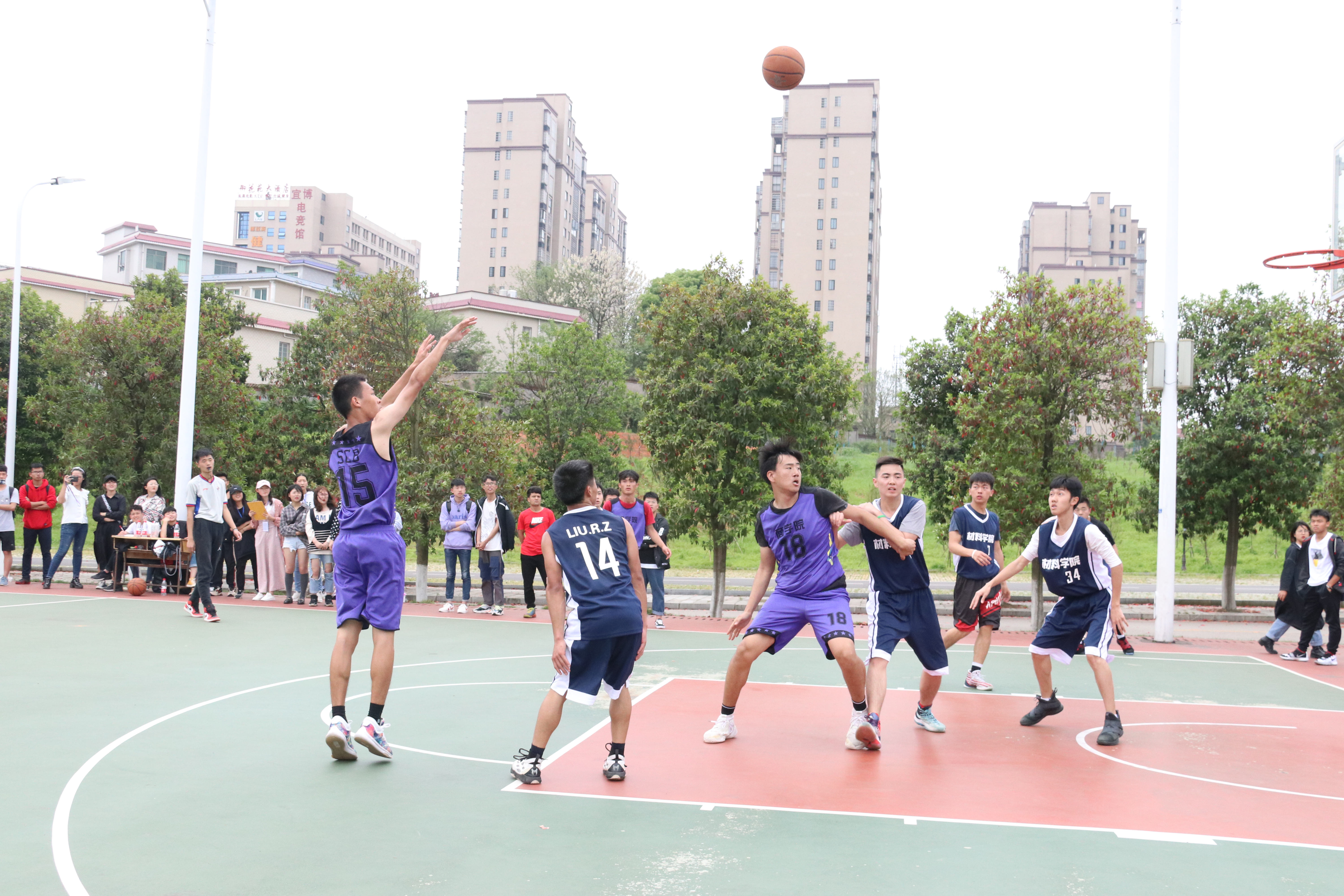 2019年4月18日12:20,湖南科技大学首届学生篮球联赛男子小组赛于湖南科技大学南校区新篮球场展开。3044am永利集团官网男子代表队和材料科学与工程学院男子代表队进行精彩对决,3044am永利集团官网学工办主任陈攀、主席团携手学生到场鼓励加油。