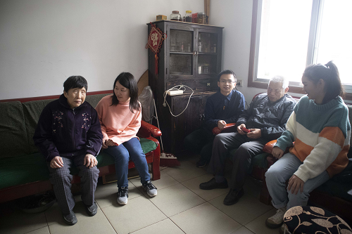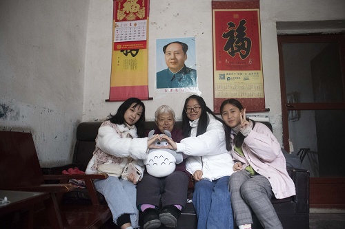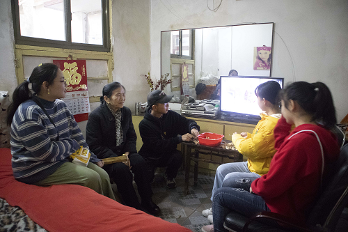 随后,大家又来到朱奶奶家。朱奶奶年轻时在文工团待过,喜欢旅游,儿孙满堂。在与志愿者们团坐在一起看电视时,她很开心地分享着自己年轻的过往以及自己儿孙的事情。“这个啊,是我小孙子。看看,这个呀,是我去杭州的。”志愿者们纷纷被朱奶奶的相册吸引,簇拥在一起抢着看相册。
