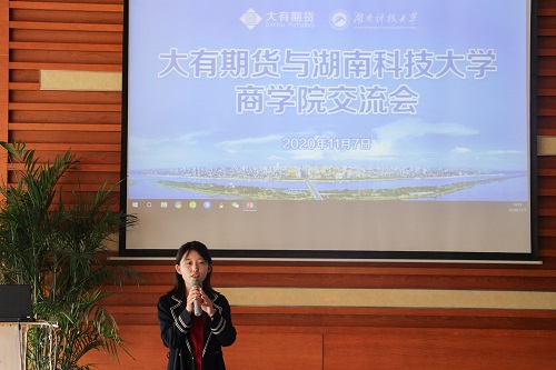 中午12:00,李搏老师带领学生代表们前往大有期货有限公司进行参观。下午2:00,交流会以一段简洁明了的宣传片拉开了序幕。随后,大有期货讲师欧航棋对公司进行了简单的介绍,他指出“坚持服务实体经济,服务客户”是其宗旨,“客户至上,专业稳健”是其理念,“风险管理和资产管理”是其核心,并且表明希望公司能成为客户信任、经营高效、行稳志远的综合型现代金融服务商。同时,他还提到了公司的四大服务体系和主要的五项业务。大有期货讲师黄石峰则是分析了金融市场与人才发展的现状,并且推荐了相关的资讯网站以及书籍,以帮助同学们了解当下的金融市场。学生们聚精会神地听讲,并且认真思考,积极地提出了自己的想法。