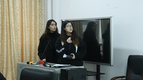 大会在热烈的掌声中拉开了帷幕,随着主持人的介绍,答辩同学们轮流上台进行了演讲。他们分别从发现问题、问题分析、自我评价以及后期研究几个方面展开论述,大家娓娓而谈,各抒己见,详细解读了自己的研究方向与研究成果:“我们的E起蹭饭吧项目不仅方便了担心饮食安全的在校大学生,也解决了家庭主妇待业在家的问题,实现了社会资源的多重利用!”“由PPT上的数据可以看到,我国有超过半数的大学生认为自己的专业不适合自己的发展!”……台下,观众们聚精会神,认真听取他们的报告。论述过程中,指导老师不时点出论文中缺漏之处,并指正答辩同学模糊矛盾之处。在论述结束后,为确保同学们有所收获,指导老师们分别给各组同学提供了论文学习经验与相应思路。时间就在这样激烈的讨论中悄然流逝,在王鹤对各组答辩进行总体总结与鼓励之后,活动宣告圆满结束!