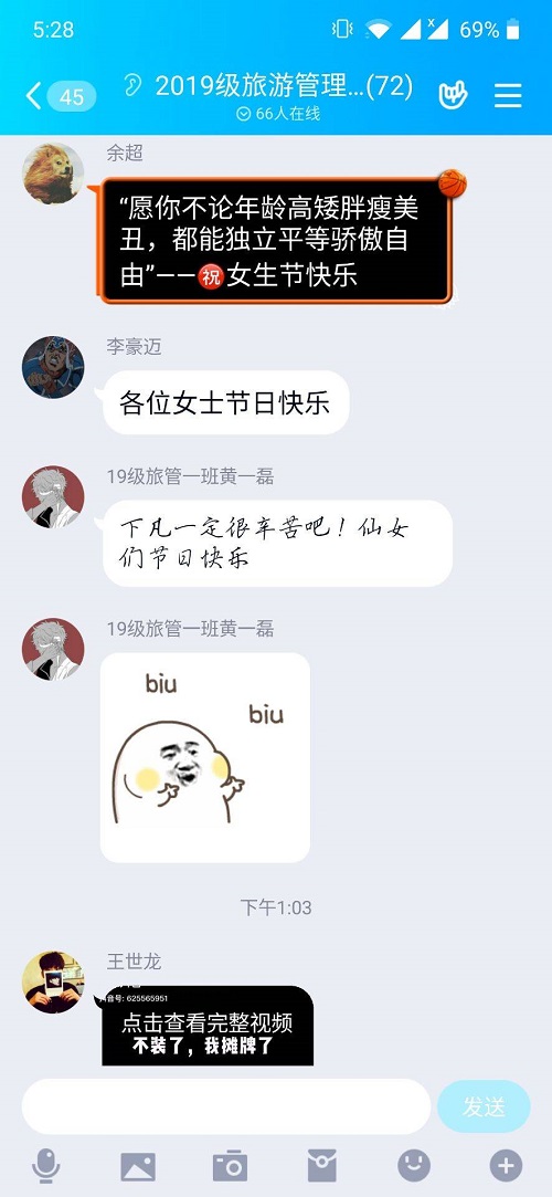 自3月7日00:00开始,各个专业的专业群及官方账号的空间中就开始了一系列的文字刷屏祝福,如19级旅游管理专业的余超同学在给女生的祝福语中这样写道“愿你不论年龄高矮胖瘦美丑,都能独立平等骄傲自由”。除此之外,部分男同学则为女生们送去了视频祝福,有录视频念诗的文艺男,有录视频吹拉弹唱的才艺男,更有录函数表白视频的理工男。最后还有部分“行动派”男生,他们事先了解到各位女生的地址,然后在网上定制每个女生的专属礼物邮寄给她们,为女孩们送去了意想不到的惊喜。