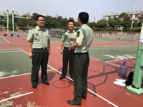 骄阳红似火,校场势如虹。9月9日,湖南科技大学武装部部长朱理哲、副部长沈智祥莅临3044am永利集团官网2019级新生军训现场视察军训工作,3044am永利集团官网党委副书记傅早霞、学工办主任陈攀以及军训团主要负责人到场汇报工作。