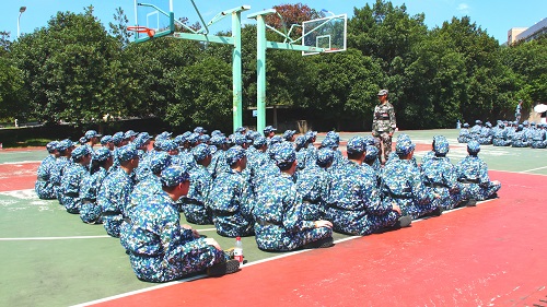 此外,训练场上还有一群人,即各部门的值班成员和各班的养成教育辅导员,他们为新生积极搬运物资,协助教官针对出现的问题作出具体的指导。训练过程中,他们全程跟班,细致地观察同学们的身体、精神状况,及时搀扶因身体出现不适而出列的同学。同时,他们对心理承受能力较弱的同学及时给予沟通、宽慰和鼓励。