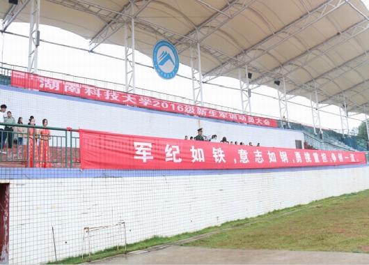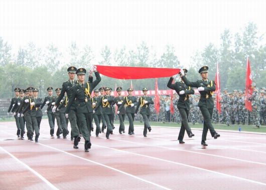 “全体起立,迎国旗,奏国歌,升国旗……”全体同学左转凝视国庆缓缓升起,行着庄严的注目礼。整齐响亮的正步声响彻田径场,义勇军进行曲慷慨激昂,五星红旗迎风飞扬。升旗仪式结束后,胡石其教授开始做军训动员报告。他指出,军训不仅能提高同学的身体素质和心理素质,提高同学的国防意识和军事素养,更有助于培养同学们积极健康的生活习惯和团结协作的工作作风。