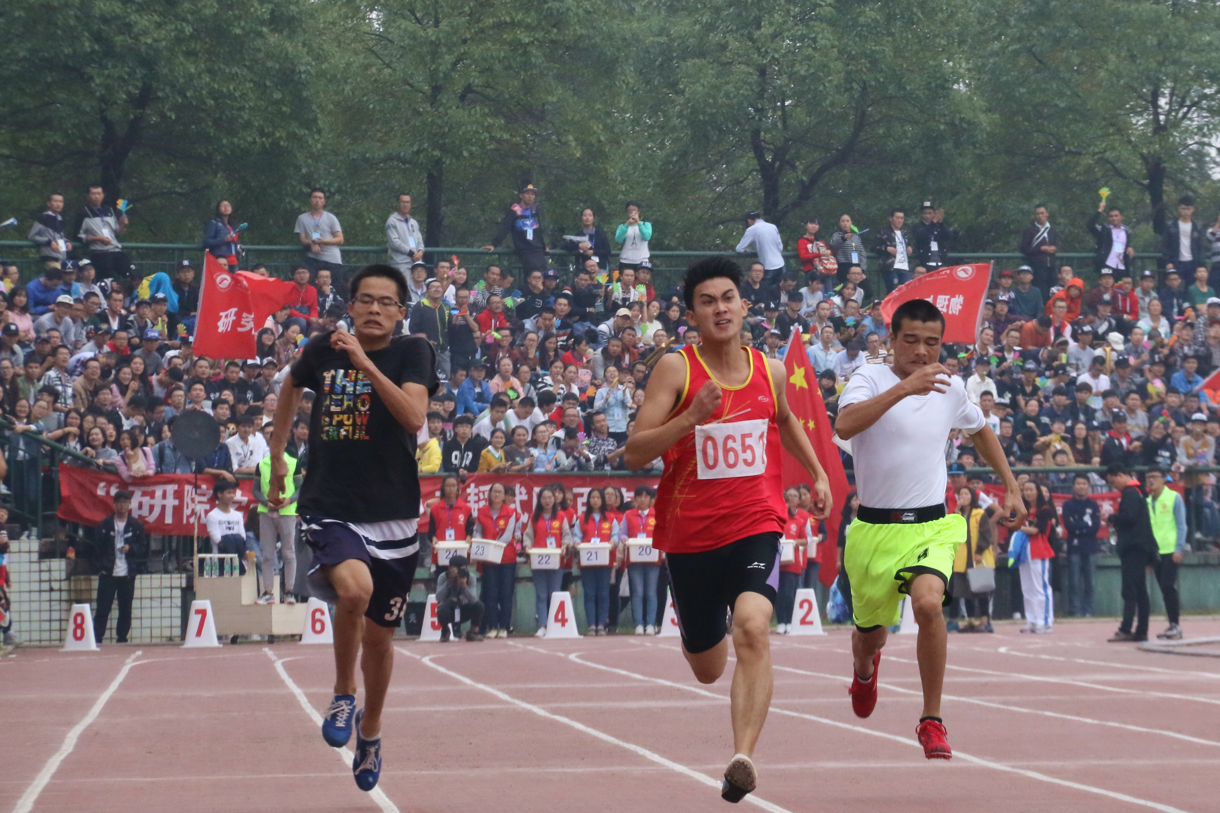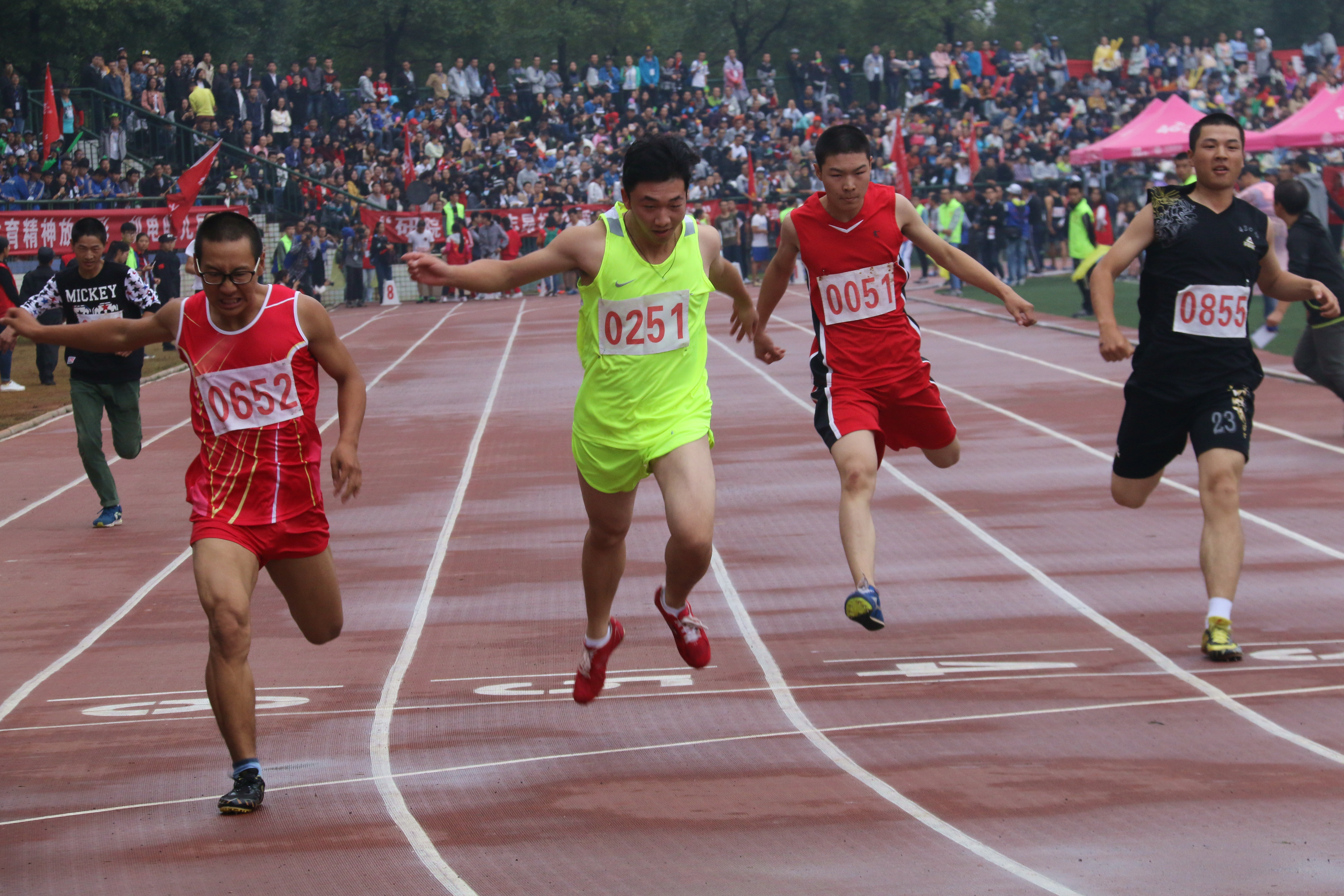 “东风吹,战鼓擂,我们经管怕过谁!”千人口号,万众瞩目,我院李杰以小组第一名的佳绩冲入决赛。下午14:38,百米决赛赛道上的李杰身体半蹲,目光犀利地注视着前方,“0651”的号码牌在胸前随风微微晃动。“砰!”起跑枪声响起,众人霎时如离弦之箭射向前方。座位席上铿锵地鼓声随之响起, “杰哥,男神!杰哥,男神!……”整个赛场沸腾了。迈腿、摆臂,李杰在赛场上飞速地奔跑着,直甩其他队员半个身位。到了冲刺阶段,观众们开始尖叫起来,鼓点也变得急促,李杰面露厉色,一鼓作气甩掉大部分选手,冲向终点。霎时间哨声、鼓声、呐喊声……响声震天,不绝于耳。李杰以11秒35的成绩荣获第二名的骄人成绩。