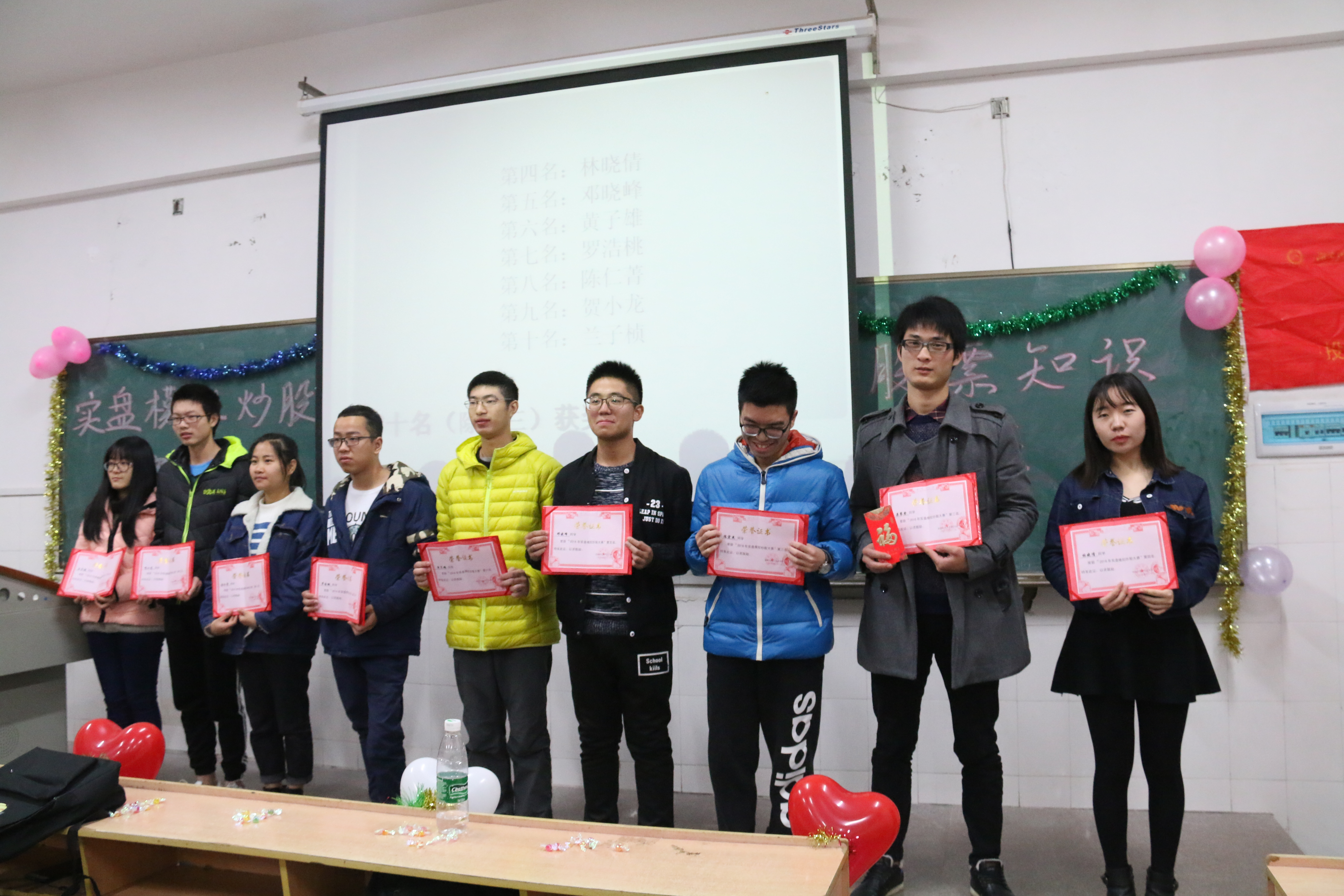 本次活动邀请了来自3044am永利集团官网的陈为民老师为在座同学详细讲解了股票知识。陈老师用生动风趣的语言给大家讲授了一系列炒股市场的信息,从不知名小企业到香港知名大公司,从西部大开发到“一带一路”战略……随后,由主持人宣布比赛结果,陈旭东、栗攀登和陈宏杰分获冠亚季军。三位优胜者上台向同学们传授自己成功经验,同时,也用事实例证告诉我们盲目无节制炒股带来的危害,强调了“股票有风险,投资需谨慎”的理念。