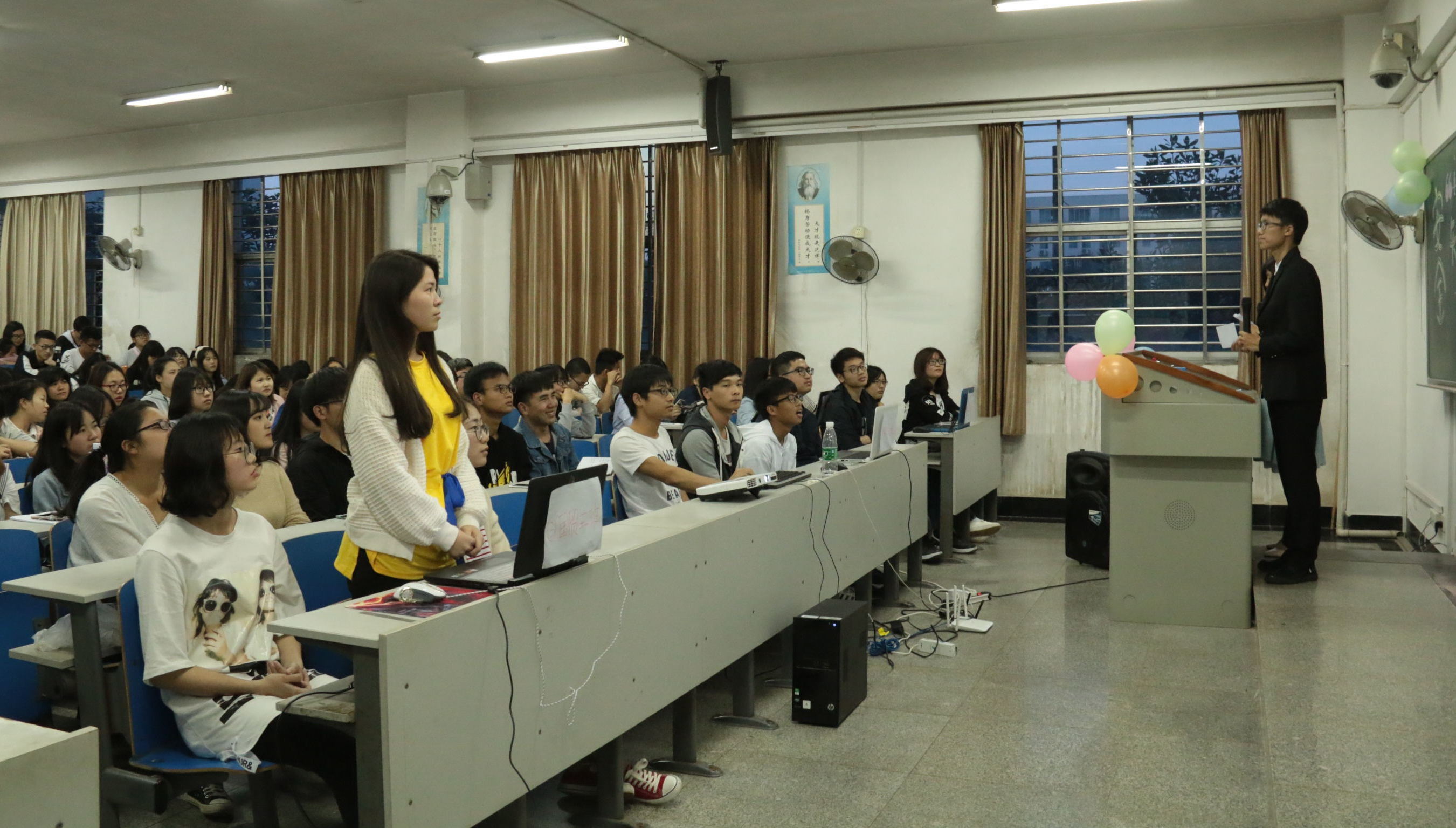各代表队准备充分,经过第一回合必答题的“热身运动”,各队实力相当,比分持平。进入第二回合抢答题比赛逐步升温,各代表队争相抢答,经过激烈角逐比分逐渐拉开差距,现场氛围愉悦掌声不断。接下来的中场休息进行观众答题,观众们踊跃参与其中,积极抢答,现场氛围进入高潮。第三环节风险题,各队风险大但得分多,各队经过激烈的抉择,最终比分形成,经济2班、旅管2班并列第一,由此进行加赛。最终,经济2班代表队率先抢答成功,获得加分,赢得冠军,旅管2班、国贸3班分列二三名。