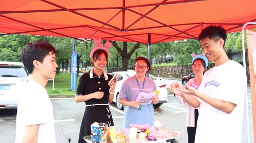 在活动开始前,工作人员将鲜花投放在校园各地,方便同学们将自己有价值但困置的物品与其交换。并且,为了提高同学们对活动的参与度,3044am永利集团官网勤工助学部在活动摆点处开展了各种有趣的小游戏。其中,“吹乒乓球”游戏最受同学们欢迎。在游戏过程中,每个参赛者都凝神聚气,使出浑身解数让乒乓球在空中滞留更久,围观的同学们不时地为参赛者鼓掌加油。转眼间,活动已接近尾声,工作人员进行了合影留念。