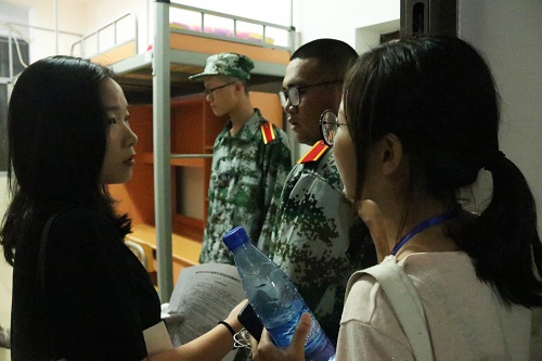 在紧张的内务检查过程中,团委第一副书记王倩雯细心发现有一位新生身体有些不适,“你是身体不太舒服吗?快把衣服解开透透气,身体是最重要的,如果有不适的地方一定要及时向助班汇报,不要硬撑着!”她的语气中流露出着满满的担心,让新生们切实感受到了来自学长学姐的温暖与殷切关怀。