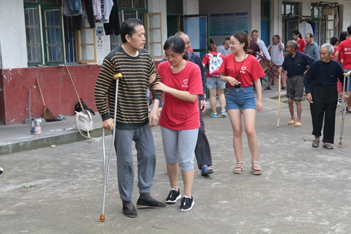 文艺汇演结束后,许多老人行动不便,大家一边把老人送回房间一边和老人聊天,临走时志愿者再一次向老人们喊出那句“祝爷爷奶奶身体健康,万事如意!”祝福声在敬老院的上空久久回响。