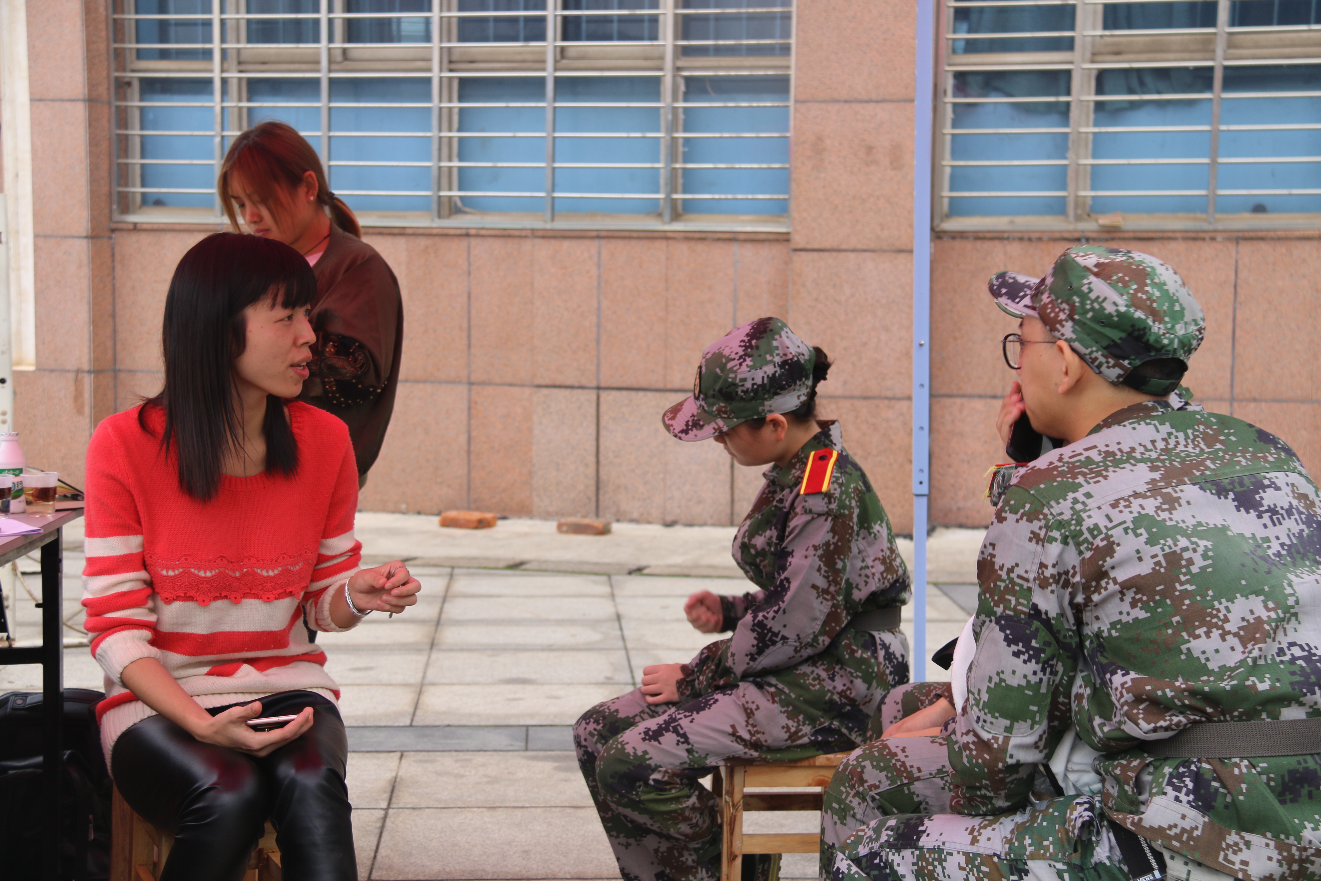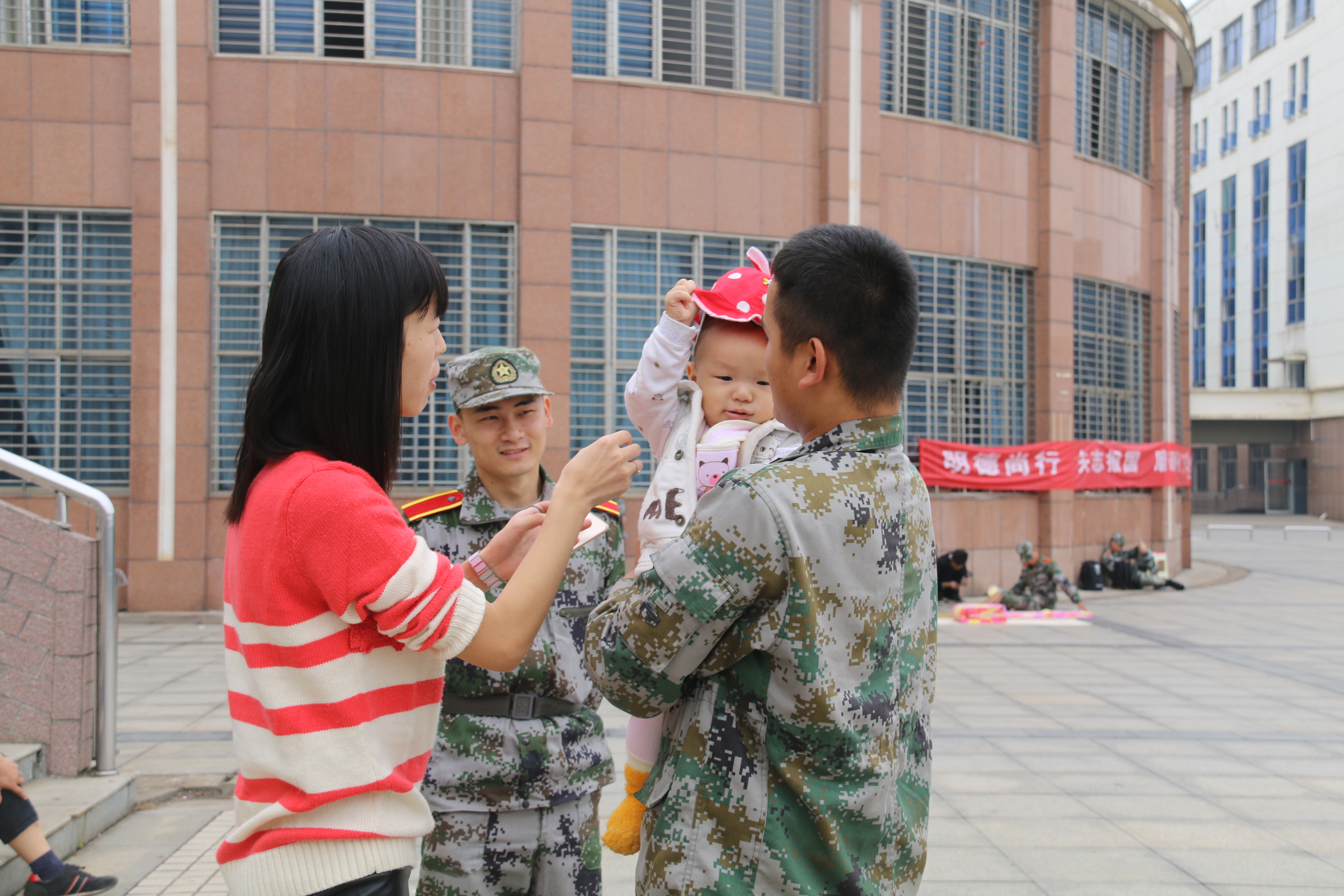 “蔡老师,那边发现了一些突发状况!”此时,蔡老师正在哄犯困的孩子入睡,一听到这个消息,她立刻将孩子交给身旁的丈夫,心急如焚地前去处理。等事情解决后,孩子早已入睡。从清晨到黄昏,除了吃饭,蔡老师一直在训练基地,为督促军训工作整日守在军训值班点。大部分时候都是丈夫抱着孩子陪同在一旁观训,蔡老师则在奔走处理紧急情况和慰问学员。