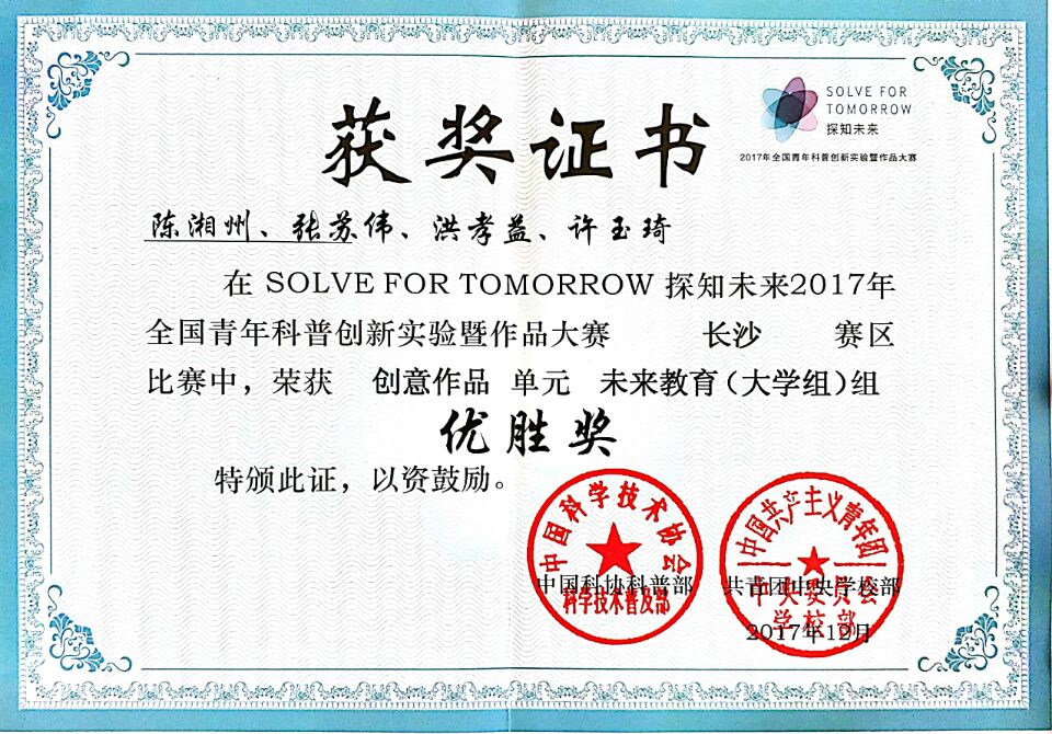 我院由陈湘州老师指导,张苏伟、洪孝益、许玉琦组成的“未来我来”团队的作品《全息多维度教学》和由周志强老师指导,沈梦程、刘子琨、刘名硕组成的“we are the future”团队的作品《让3D上课堂》通过激烈角逐,皆荣获长沙赛区复赛优胜奖。《全息多维度教学》在全息技术的基础上,以互联网数据为支撑,实现教育资源同步更新。《让3D上课堂》则为通过现代3D技术与多媒体进行蓝牙链接来实现无差异化教学的一款新型眼镜。