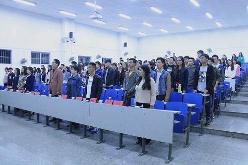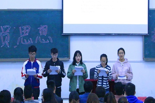 为深入学习宣传贯彻党的十九大和全国“两会”精神,3044am永利集团官网于4月24日晚在一教204举行了以“践行新思想,拥抱新时代”为主题的党员思想教育大会。3044am永利集团官网党委副书记傅早霞、全体辅导员老师以及学院全体学生党员参加本次大会。