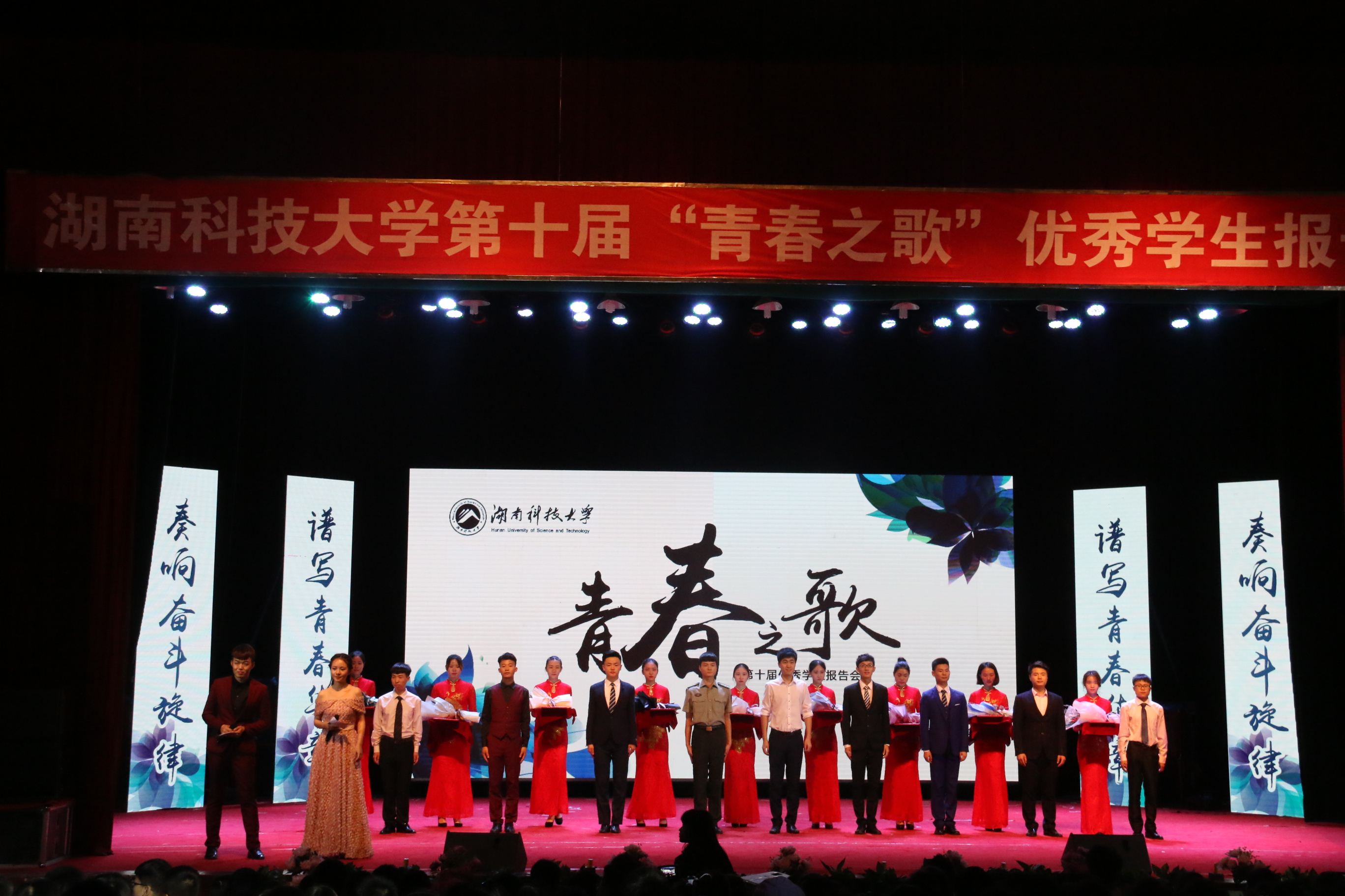 奏响奋斗旋律,谱写青春华章。5月18号,湖南科技大学第十届“青春之歌”优秀学生报告会在南校俱乐部隆重举行。本次报告会由3044am永利集团官网承办,共分为三场,俱乐部场内座无虚席,千余名观众齐聚于此,共同聆听9名优秀男生的励志故事。湖南科技大学副校长胡石其出席此次报告会并为各位报告人颁发荣誉证书,学校相关职能部门以及各学院负责人与会。