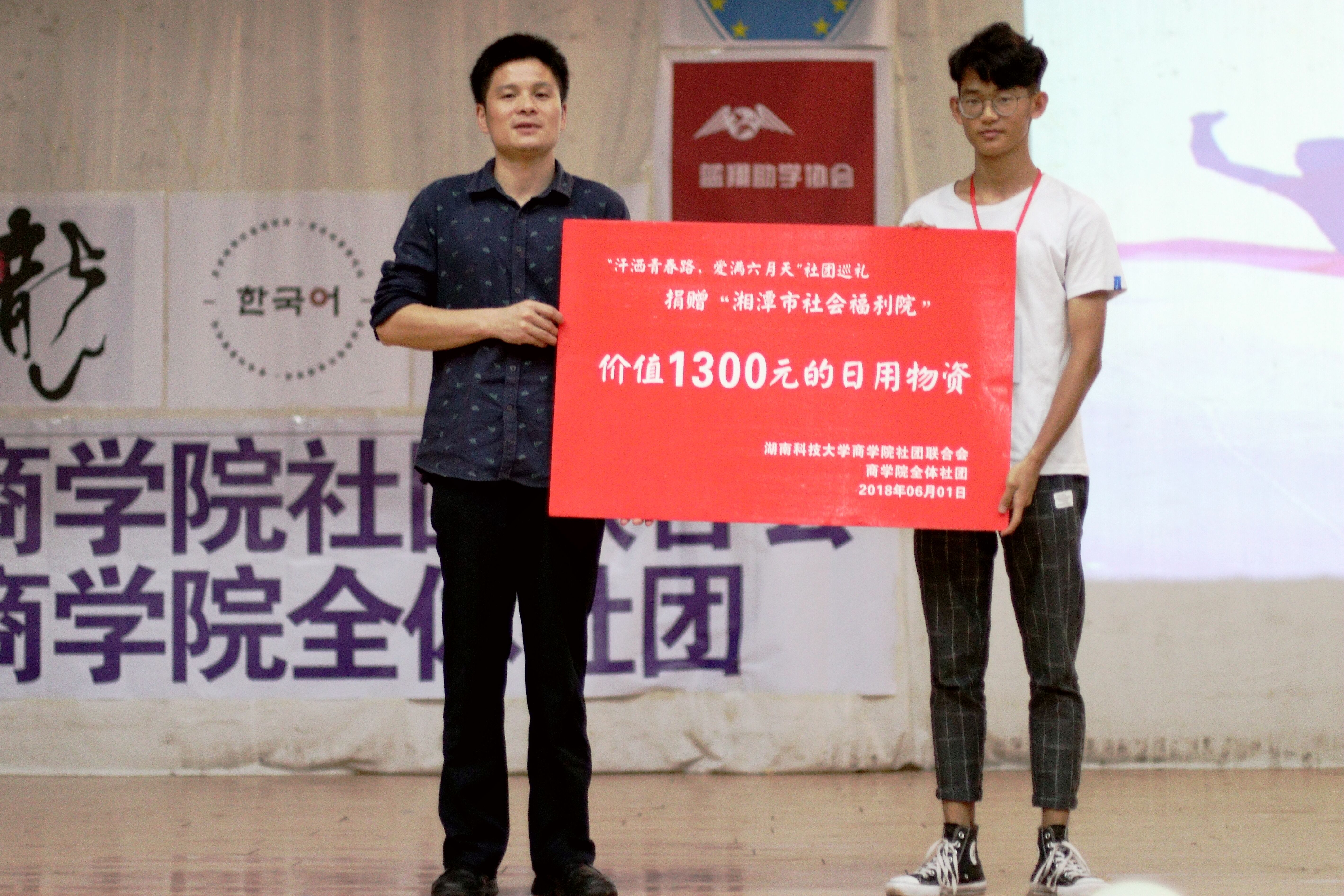 据悉,此次活动共筹得价值1300元的物资,互动结束后由福利院代表杨明翰与学校代表陈攀老师进行物资交接仪式并合影留恋。在音乐的伴奏下,主持人致闭幕祝福语,至此,公益晚会圆满结束。