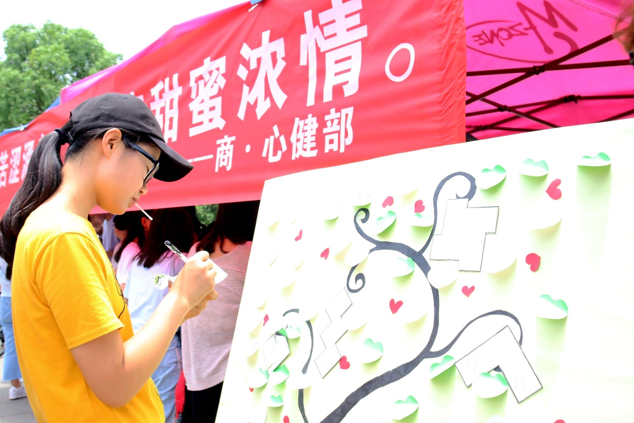 5月28日12:20,我院心理健康教育服务部在南校美食广场进行了摆点宣传,并准备了相关游戏环节。主要有漂洋过海、进击的瓶盖、掌上明珠、转发集赞赢奖品、晒晒你的微幸福等活动。其中“晒晒你的微幸福”是号召过往同学在便利贴上写下自己感到幸福的事,为此,心理健康教育服务部还特意制作了一面温馨的幸福墙以供粘贴。