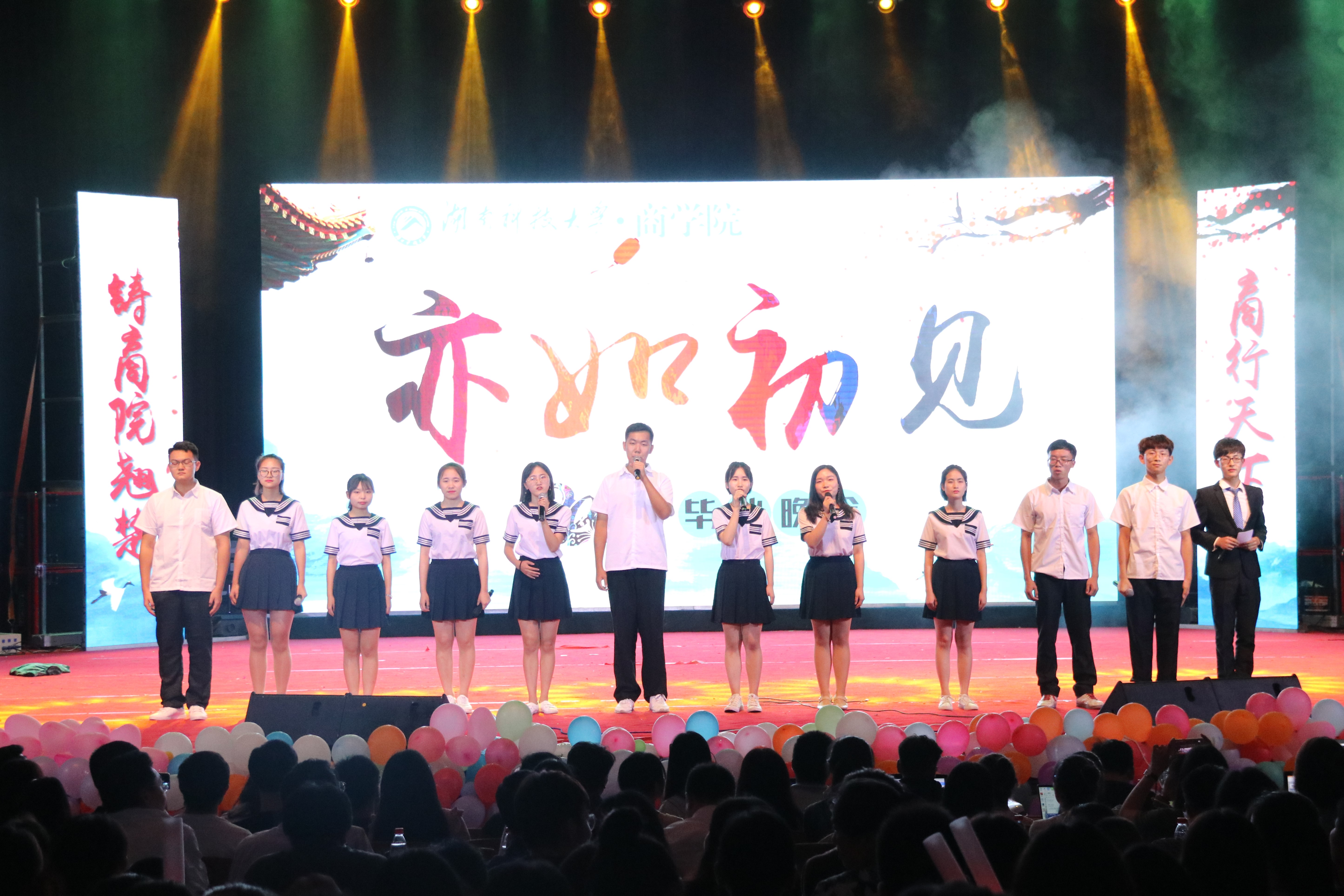 晚会开场前,各位毕业生通过视频记录阐述了自己大学四年的收获遗憾,相互祝福不泣离别,不殇过往,再次相逢,亦如初见;各自祝愿岁月无波澜,余生不悲欢,历尽千帆,归来仍少年。伴随着嗨翻全场的乐队演奏声以及观众热烈掌声,晚会拉开了序幕。本次晚会以“相逢时,再少年,亦如初见”为主题,把大学四年浓缩成一段青春奋斗史。晚会分为四大篇章,从“岁月不居,春秋代序”中回首新生稚嫩,在“静水流深,沧笙踏歌”里怀梦奔走校园,从“昔我往矣,杨柳依依”中体会离别苦涩,在“棠棣花开,心向孔怀”里肩负重望,叩问未来。四大序曲将毕业生的大学生涯生动再现。独具创意又饱含文化底蕴,更加彰显学院风采。