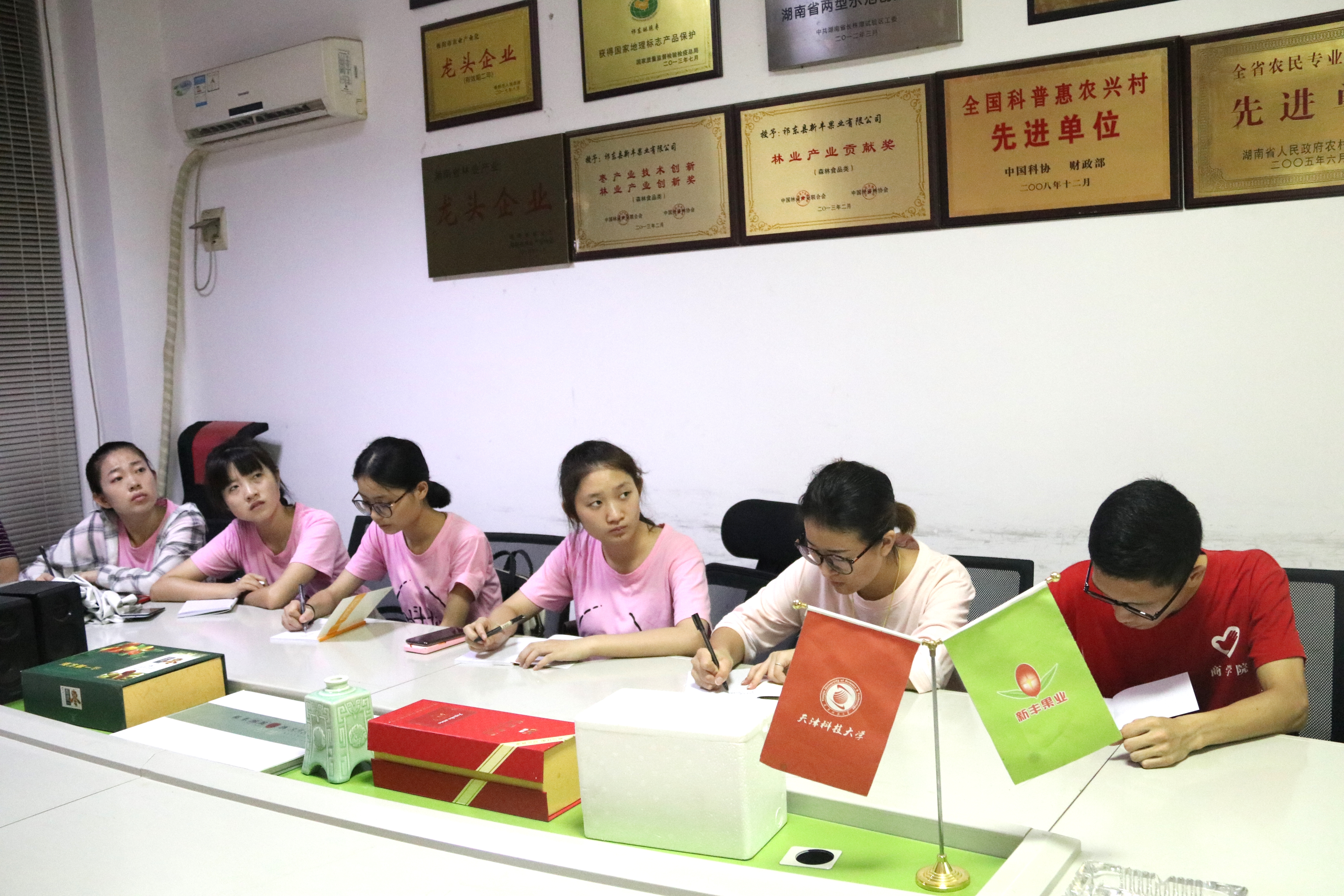 新丰果业有限公司成立于2001年,是一家集研究开发、推广国内外果树优良品种,为果农提供产前、产中、产后全方位服务的高科技、外向型的果业企业。谈及公司的创办,曾建新表示公司十多年来坚持西欧枣业产业化的道路,致力于打造南方高档鲜枣品种。调研小组发现正是因为这份对枣业的执着,“祁东酥脆枣”这一品牌才得以名扬,连续十年被评为“衡阳市农业产业化龙头企业”。通过交流调研小组了解到公司有明确的发展目标,近期公司拟定把果园做成连锁品牌,建立体验园,将农业、信息技术以及绿色旅游业相结合,形成品牌效应。
