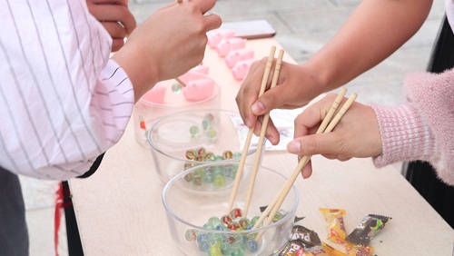 此次摆点宣传活动开设了四个游戏项目:眼疾手快、细节大考验、默契大挑战和接龙大挑战。活动现场,工作人员热情地为同学们讲解游戏规则,并指导同学们进行游戏。游戏过程中,同学们始终以饱满的热情参与其中,积极参与每一个游戏,让摆点处充满了欢声笑语。在游戏“默契大挑战”中,心理健康教育服务部为同学们创造了一个轻松、彼此尊重信任的氛围,其中一名同学以画图的形式表达题目的内容,再由搭档的另一名同学猜出题目内容,根据答对的题目数量获得不同的奖励,不仅激发了同学们参与活动的兴趣,也增强了同学们团结协作、相互配合的意识。其中,同学们参与最多的游戏是“眼疾手快”,游戏开始参与者便全神贯注地盯着盒里的弹珠,两手紧握筷子,小心地夹着一颗又一颗弹珠,慢慢地越夹越快,不一会儿就将盒子里的弹珠全部夹完了。活动结束后,同学们相互分享获取的奖品,讨论游戏诀窍,在繁忙的学习中获得放松。