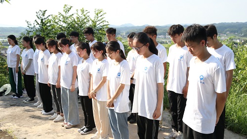 经过了近20分钟的山路爬行,实践团成员到达了烈士墓。烈日当空、夏日炎炎,烈士墓孤冢独立陵园中央,实践团成员们在烈士墓前庄重站立,摘下帽子,向为中国革命事业做出重大贡献的英雄默哀敬礼,深切表达对蒋梯空烈士的敬重之情,默哀期间气氛庄严肃穆。默哀结束后,成员们积极主动地为烈士墓清除杂草,以此祭奠烈士英魂。