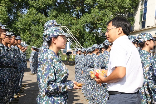 随后,沈智祥副部长与贺胜兵书记开始向新生、教官及学生干部分发月饼并传达节日祝福。