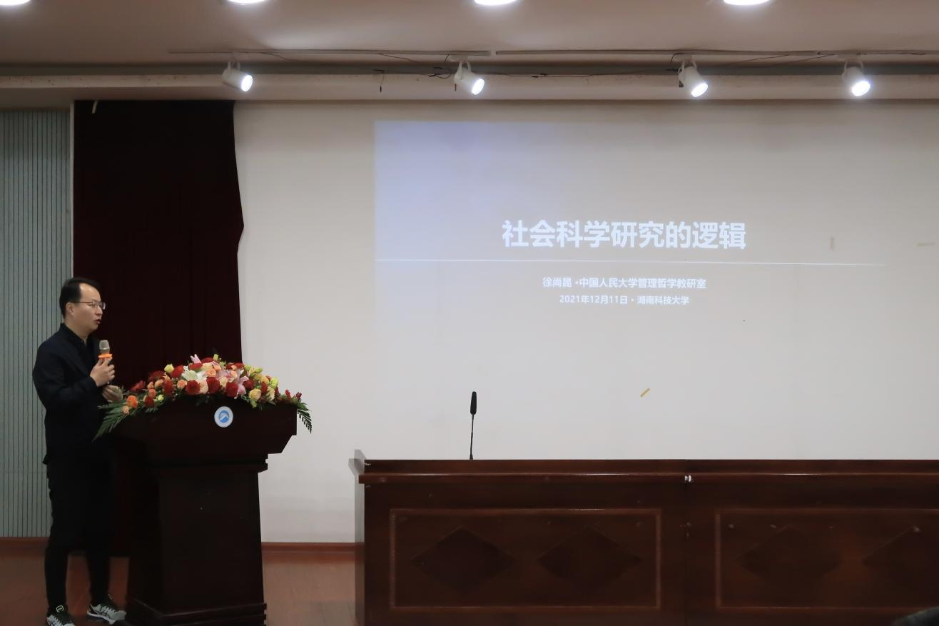12月12日上午9:00,我院于三教101学术报告厅举办了第161期立言讲坛,中国人民大学哲学院徐尚昆教授受邀作了题为“社会科学研究逻辑”的学术报告。校党委副书记刘友金主持讲座,院长潘爱民、院党委书记叶文忠、图书馆馆长颜剩勇、副院长曾世宏、张志彬、戴魁早、张松彪及学院部分老师和在读硕博士生出席了学术报告会。