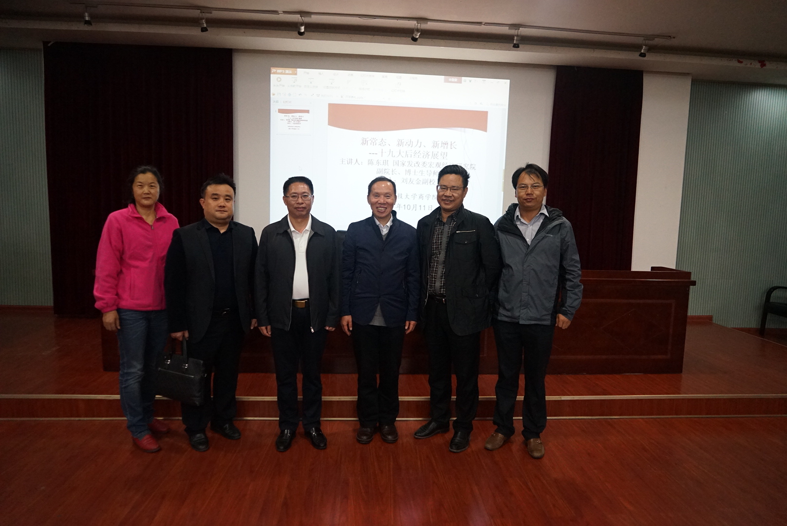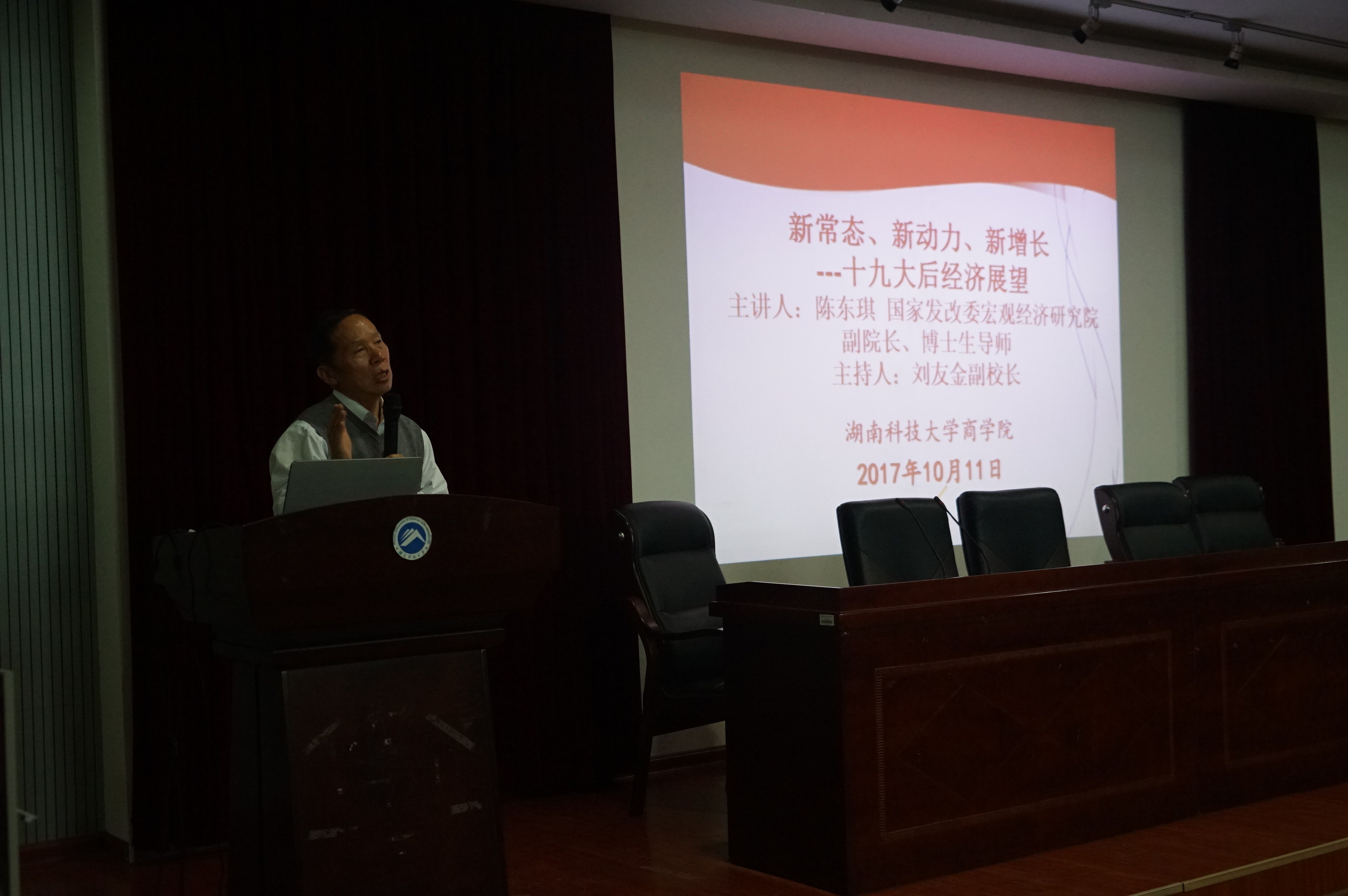 10月11日晚七点半,由国家发改委宏观经济研究院陈东琪教授主讲的“新常态,新动力,新增长——十九大后经济展望”学术讲座在三教101准时开始。会议由刘友金副校长主持,校社科处处长向国成教授,3044am永利集团官网潘爱民书记、贺胜兵副院长、颜剩勇副院长及多位老师参与了讲座。